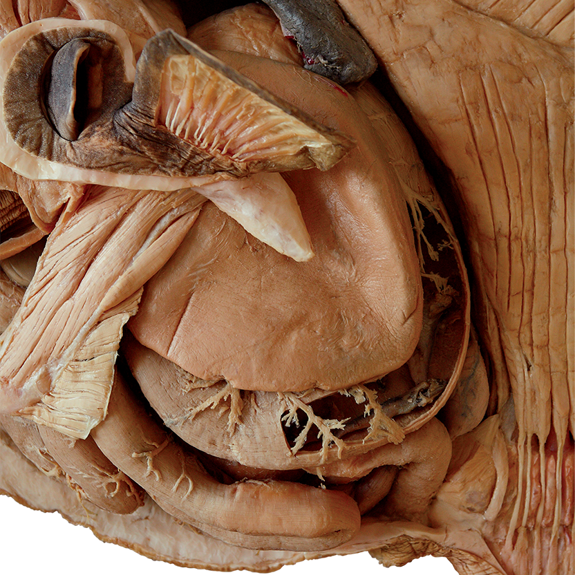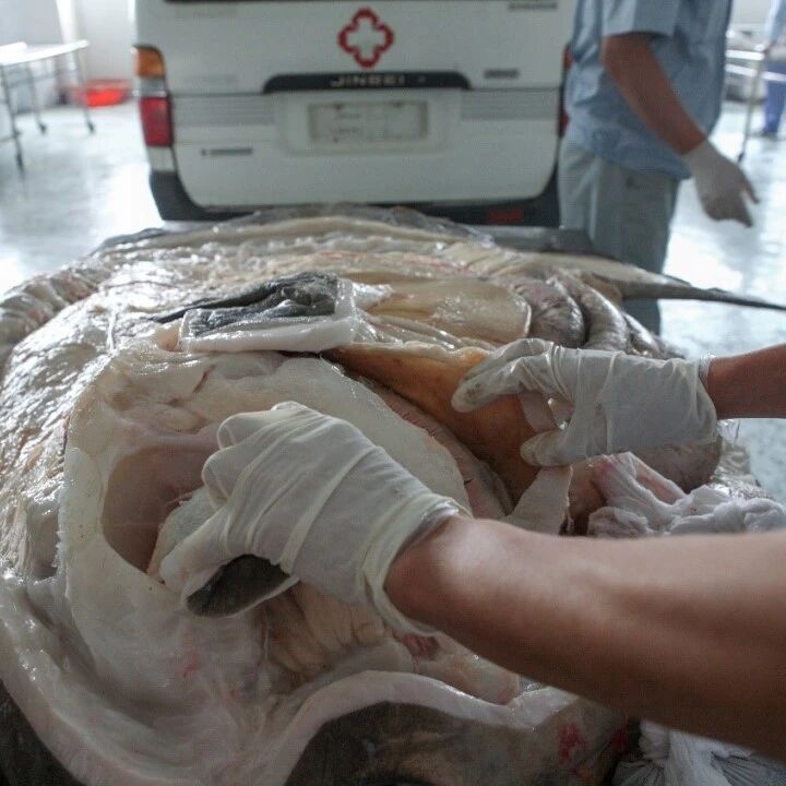很快,孟文件就将翻车鱼一侧厚厚的皮肤完整地切取了下来,露出深层特点明显的肌肉以及与之相连的肌腱,翻车鱼的内脏也随之显露了出来。