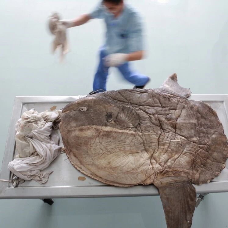 当天下午,王先生就把翻车鱼运到了大连鸿峰。我指挥着技术人员将翻车鱼放到解剖台上仔细观察,然后又戴上乳胶手套仔细地抚摸翻车鱼的皮肤,发现它的皮肤异常粗糙致密。这样致密的皮肤对翻车鱼而言是非常好的保护屏障,能将其体内的环境与周围的海水分割开,保护体内的水分不会流失。但这样的皮肤也使得用于固定保存的福尔马林难以通过渗透进入到翻车鱼的体内,无法快速终止鱼组织的腐烂。思考一番之后我决定先不进行福尔马林固定,先解剖,然后再将解剖后的翻车鱼浸泡到福尔马林里固定。